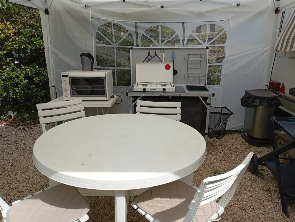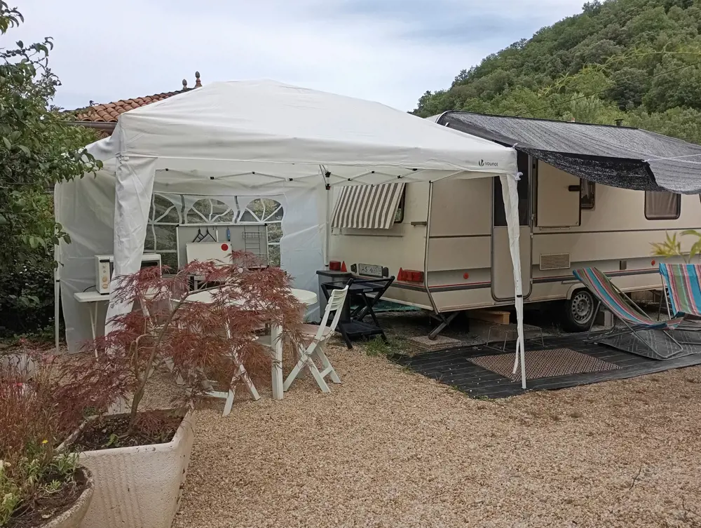 Je vous propose une caravane pour 2, dans mon jardin. Un coin nuit, un séjour cuisine et une salle d'eau. Une tonnelle 3x3, une cuisine extérieure, four, réfrigérateur, bouilloire, cafetière. Un point d'eau en face de la caravane. Vous avez à votre disposition un, une piscine et le jardin. Je propose sur réservation des massages, repas Tapas, glaces et boissons. Options lit fait avec torchons et éponges 10€ par personne, option ménage 20€.